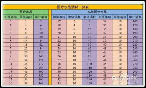 船医品级晋升需要耗损医疗水晶和高级医疗水晶,分歧品级的耗损量如下图: