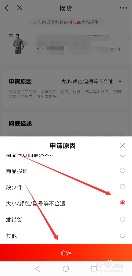 在弹出的换货因为对话框里直接点击选择【大小/颜色/型号等不合适】,如下图所示。