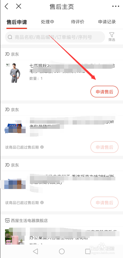 进入京东售后申请界面后,找到要申请退换的订单,直接点击后面的【申请售后】,如下图所示。