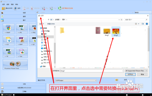 如下图,在弹出的打开界面里,找到并选中需要转换格局的图片。