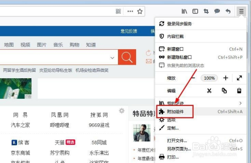 第一步,打开仗狐浏览器,在东西栏中找到并打开“附加组件办理器”。