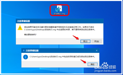 回到系统桌面上,找到并左键双击【禁止启动执行.reg】注册表文件图标,在先后弹出的注册表编纂器对话框中点击:是(Y)和确定。