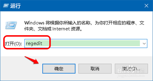 在运行对话框中输入:regedit,点击确定或按下键盘上的回车键,打开注册表编纂器窗口;