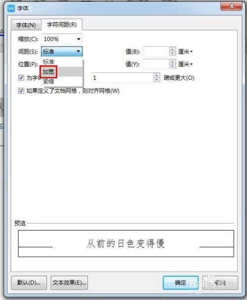 第三步:在字符间距标签中“间距”处选择加宽。