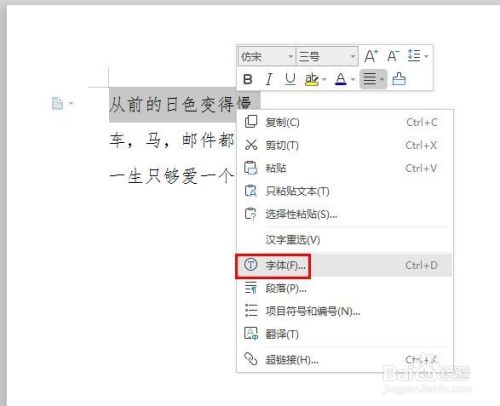 第二步:选中需要设置字符间距的文字,单击鼠标右键选择“字体”。