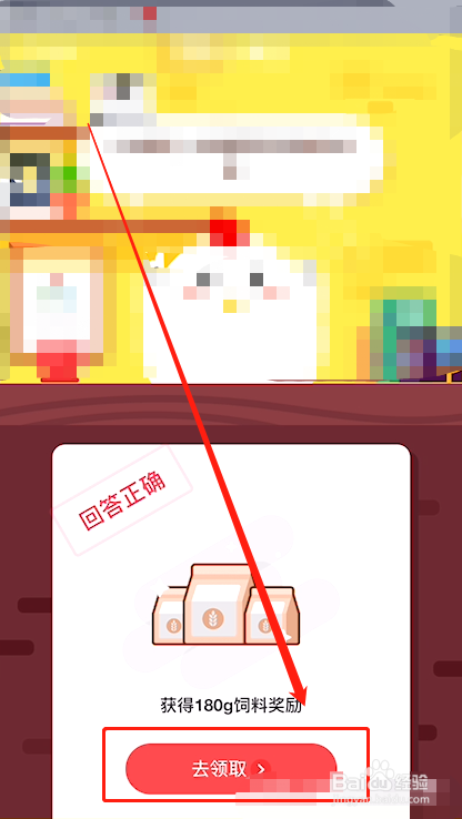 点击【准确】后,呈现了一个回覆准确的界面。这时辰,只要点击【去领取】即可,然后点击【领取】,有没有发现饲料已经增添了。