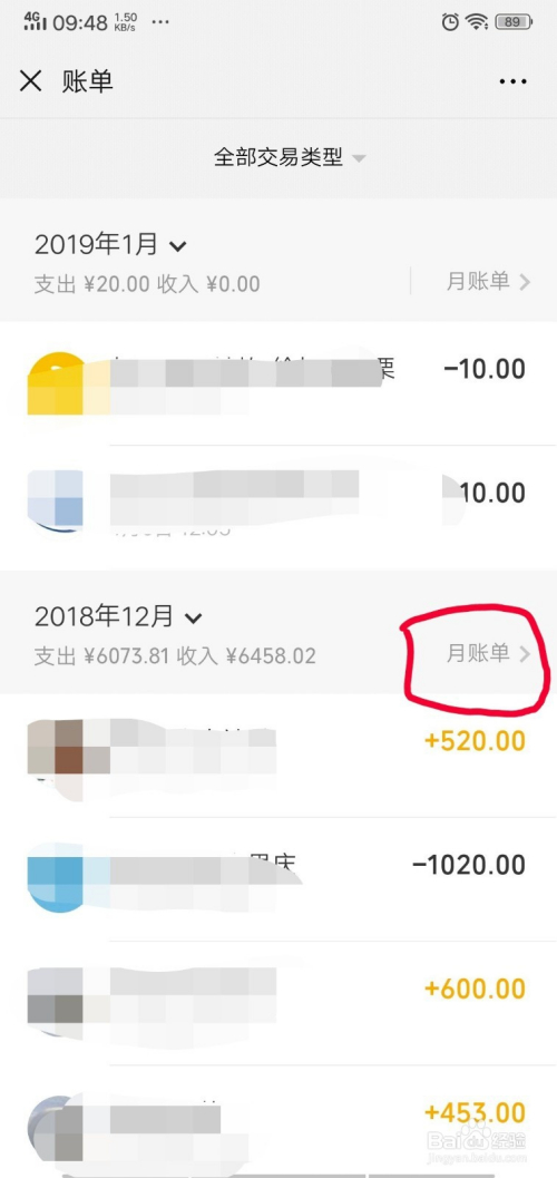 进入账单界面后,我们就可以查看近期消费账单环境,若是要查询某个月的具体总账单,我们点击某个月后面的“月账单”如下图所示。