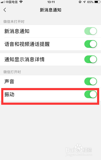 在【新动静通知】本家儿页下,找到最后【振动】一栏(如图所示),滑动右侧滑块,封闭【振动】提醒!