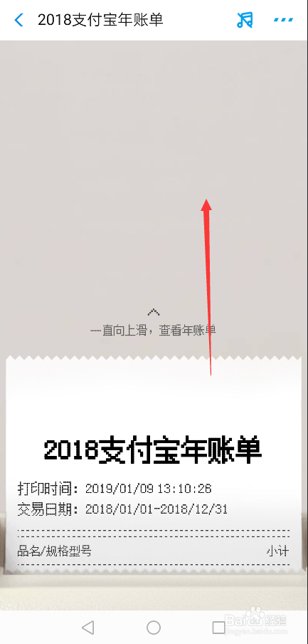 密码校验准确后,付出宝2018年度账单就可以看到了,此次是以小票的体例揭示的,直接往上滑动就可以查看了,如下图所示。