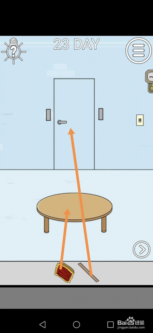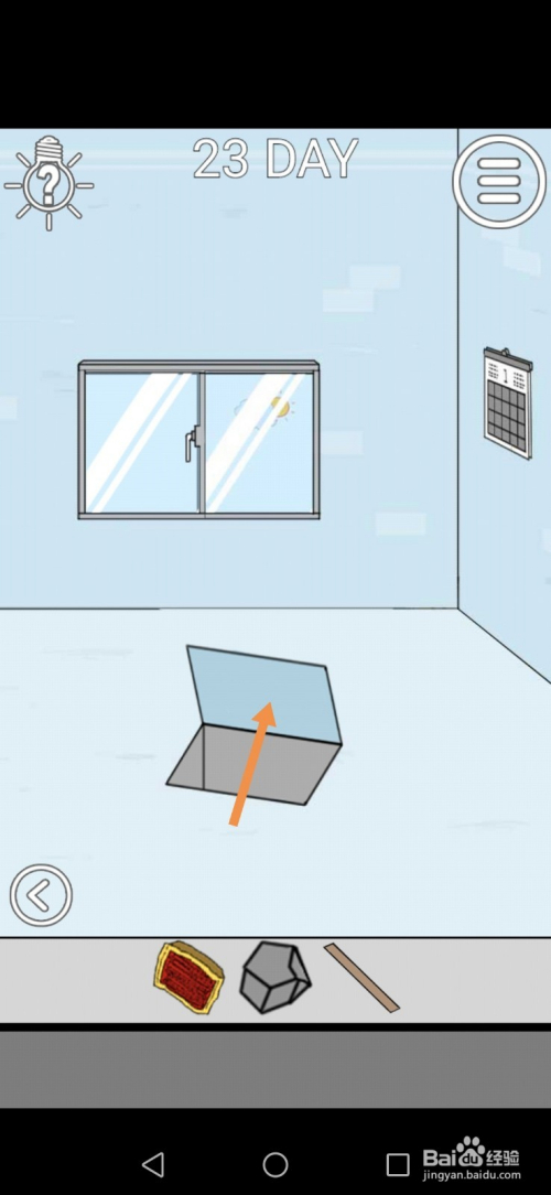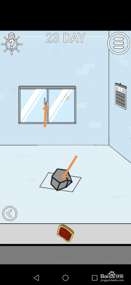 第23关点击标的目的右箭头到右边去。在右边,点击窗户锁和石头。