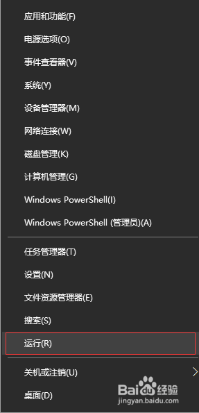 在“起头”按钮处右击或者直接按住“windows徽标+X”键呈现如图所示的界面,选择倒数第三行的“运行”。会呈现“运行”对话框(也可以直接“windows徽标+R”键组合直接唤出“运行”对话框)。