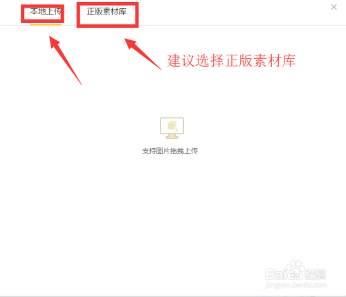 进入到图片上传页面后,我们的图片来历可所以当地计较机上保留的图片,也可以从平台的素材库去搜刮查找,建议选择平台素材库中的图片,避免本身上传的图片不及格而被拒。