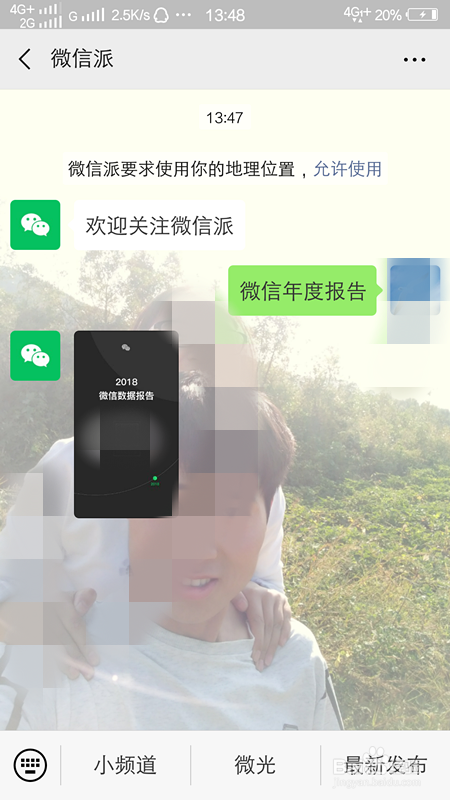我们给微信派这个公家号发布2018微信数据陈述或者微信年度陈述,他会主动识别,发给你一张图片。