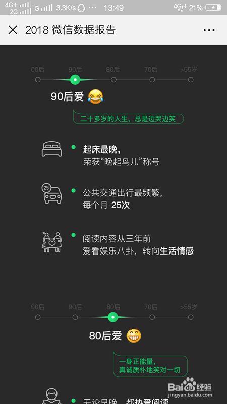 我们扫描这张图片上的二维码,即可进入微信2018微信数据陈述了,计入可查看具体信息。讲了00后,90后,80后等等年数的特点。