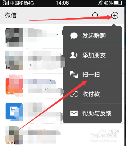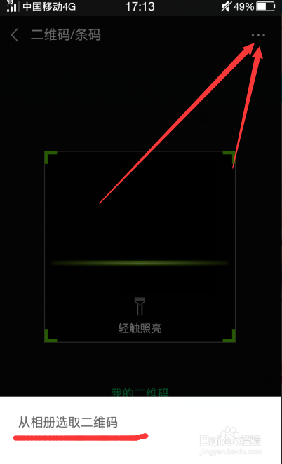 之后我们回到微信首页,点击右上角扫一扫,从相册里选择扫一扫那张保留的图片