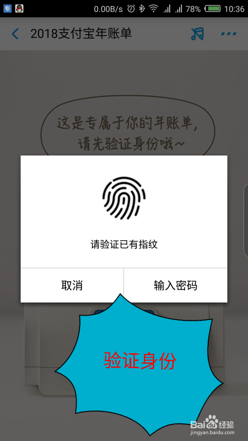 点击开启账单后,需要先验证身份,用指纹或者输入付出密码验证身份。如图所示