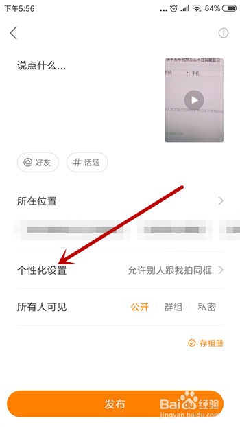两个方式教给大师,第一个设置视频,在发布里点击【个性化设置】。