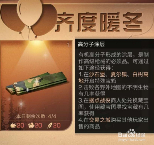 可兑换的奖励受接待的本家儿要有高分子涂层,天天可兑换4个,每个兑换需要绒毛、棉团和岛羽各20个。