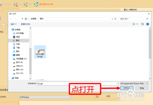 如下图,在跳出的打开界面里,找到并点击选中需要转换格局的图片。