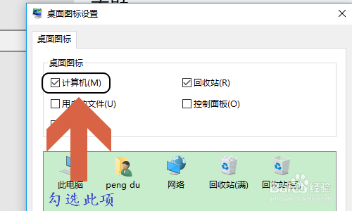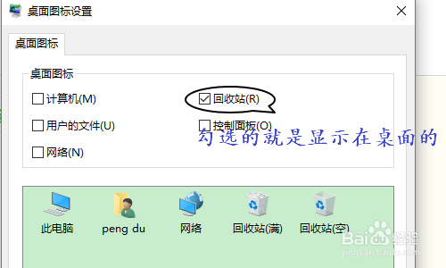 点击此项今后,会弹出别的一个对话框,在这个桌面图标设置的对话框上,最上方会显示桌面图标,此中勾选的就是在桌面上有显示的,如图所示...
