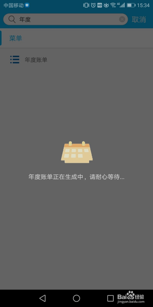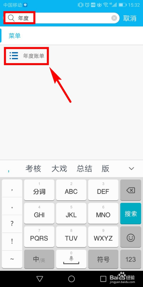 在搜刮栏中输入【年度账单】,很快在其下方就能看到年度账单搜刮成果,在搜刮成果中点击年度账单。
