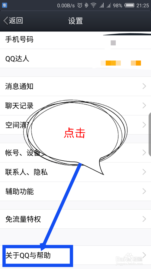 在打开的QQ设置界面,滑动屏幕到最下面,点击最下面的关于qq与帮忙选项。如图所示