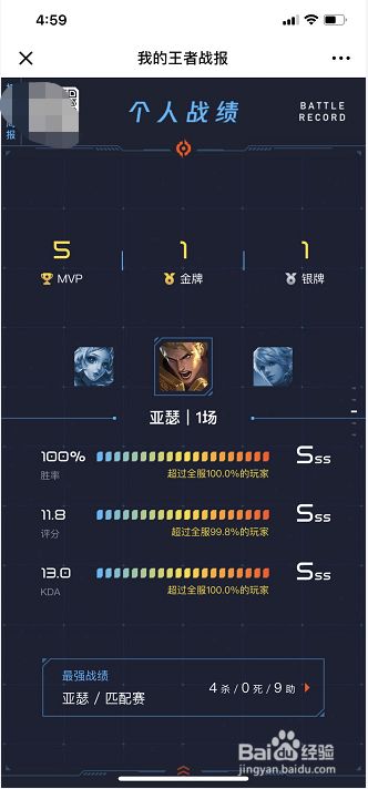 第三页是小我战绩,展示三个玩的最好和次数最多的英雄,小编的亚瑟很溜哦!