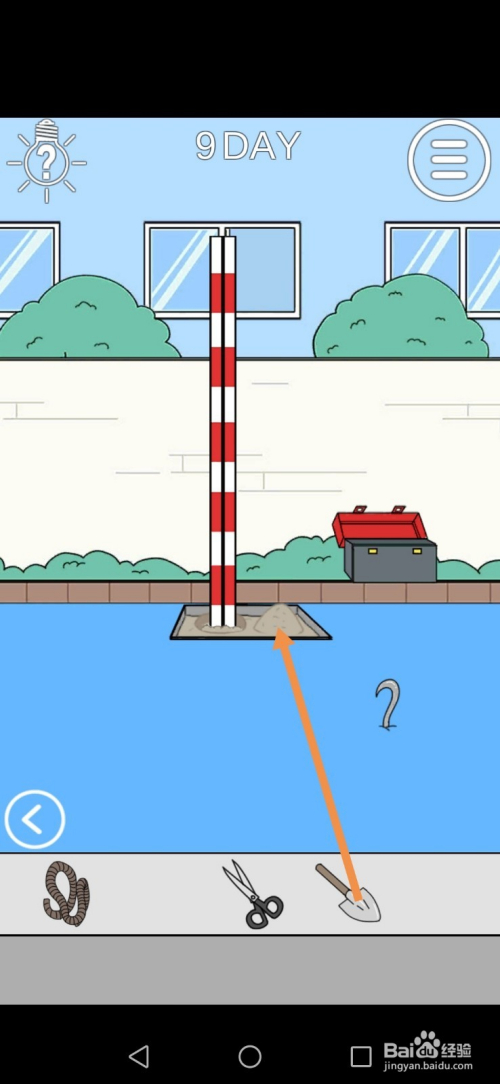 获得铰剪和铲子后,将铲子拖动到土上,然后将两根杆拖动到坑里。