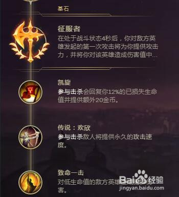 首先S9剑姬本家儿系符文带紧密系,然后点出有真实危险的征服者。再点出凯旋、欢欣、致命一击。
