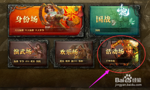 然后回到模式本家儿界面,如图所示点击右下方的(活动场)——(千里单骑)进入模式。