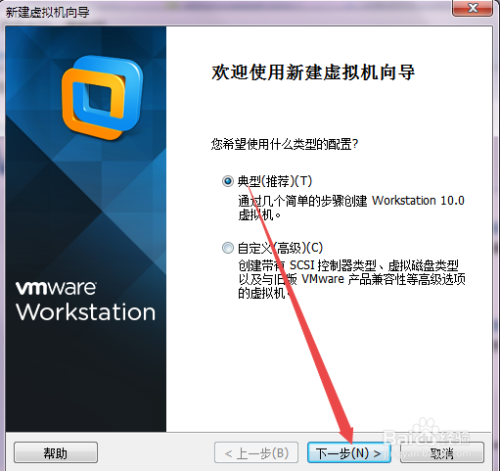在桌面上面双击虚拟机快捷体例,打开之后,点击 建立新的虚拟机,然后选择为 典型,下一步。
