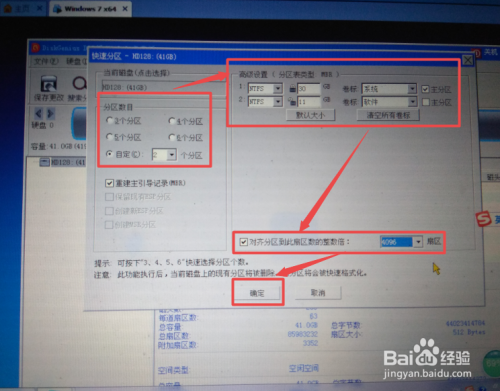 然后按照现实需要选择分区的个数,每个区的大小,可以选择对齐,点击 确定;然后就起头分区并格局化了,完当作之后,重启虚拟机。