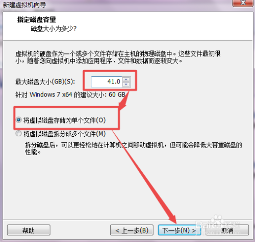 然后指定磁盘容量的大小,建议30G以上,选择为单个文件,下一步;然后在打开的页面中就可以看到虚拟机的根基信息了,点击 完当作。