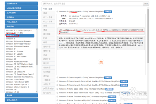 下载系统镜像。百度搜刮 ”我告诉你“ ,打开第一个网址。打开网站后:1.点击网页左侧的”操作系统“2.遴选操作系统(如Windows7)3.选择系统版本(如Windows 7 Enterprise (x64)是w7 64位企业版,其他版本的英文请自行百度查询)4.点击”具体信息“。5.点开后有一栏是ed2k,复制这一栏后打开迅雷软件,会主动弹出下载界面。