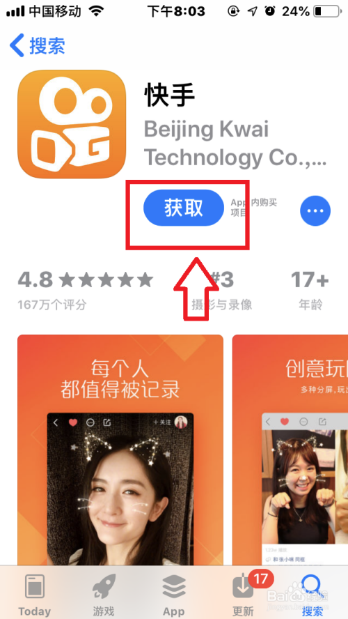 应用商铺搜刮“快手”,点击“获取”,下载安装“快手”app。