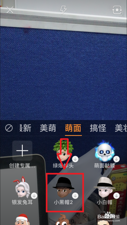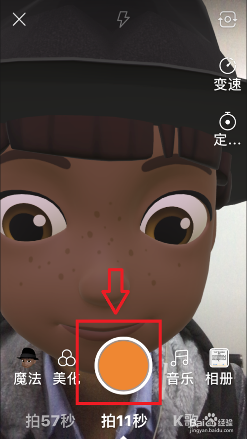 点击“魔法”——“萌面”,点击下载选择一条目“Kmoji”模子,点击底部“快门”进行拍摄。