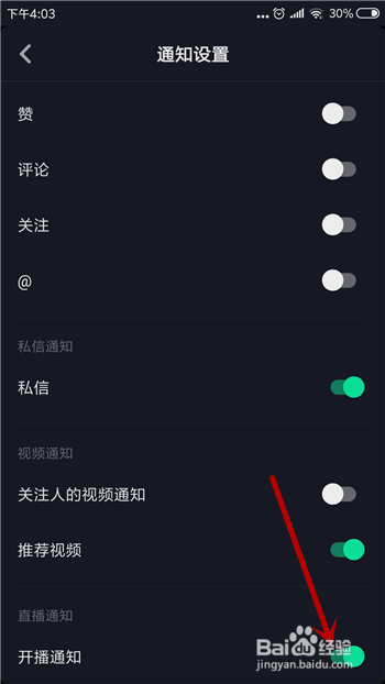 接着在通知设置中下拉找到最底部的【开播通知】并点击后方的开关。