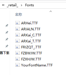 将喜好的字体文件复制入Fonts文件夹,需要复制8次,别离定名为ARHei 、ARIALN、 ARKai_C 、ARKai_T 、FRIZQT_ 、FZBWJW、 FZXHJW、 YourFontName;