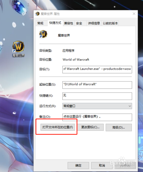 右键点击桌面上《魔兽世界》游戏图标,选择属性-打开文件地点的位置;