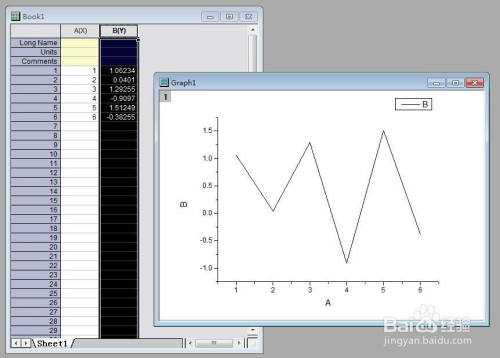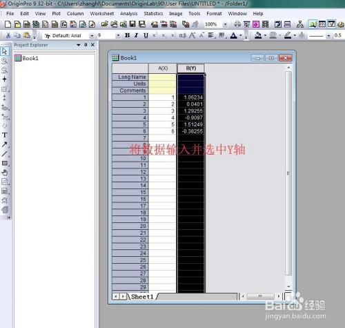 打开之后就是筹办绘图了。将横纵坐标数据输入进去,然后选中B列,即Y轴。