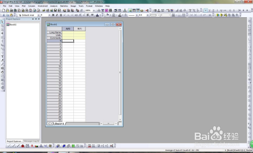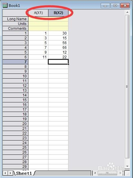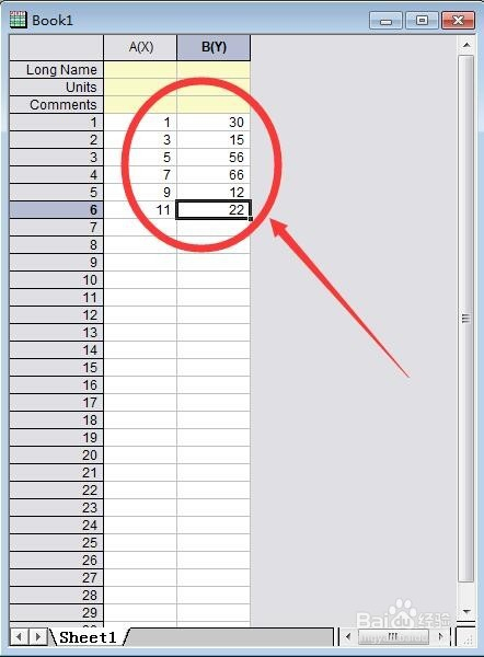 如许就打开了Origin软件,然后我们起头把横坐标和纵坐标的数据输入进去,注重:这里“A(x)”暗示第A列且该列为横坐标;同理,“B(y)”暗示第B列且该列为纵坐标;标注为“1”的行为第一行。