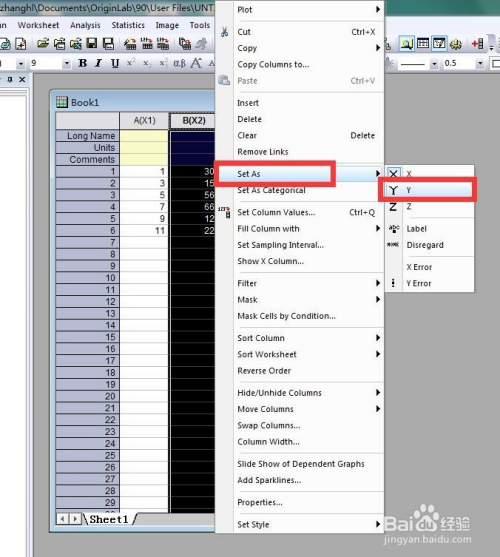 若是呈现A、B列均为X轴的环境(如下图),我们可以将B列设为Y轴。将鼠标放置在“B(x2)”的位置,点击选中该列,鼠标右击选择“Set As”,再选择“Y”即可设为Y轴。