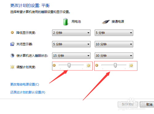 进入到更改打算的设置,在调整打算亮度的中含有两个一个用电池和接通电源的亮度选择,可以在调整打算亮度中,经由过程进度条来调整亮度。