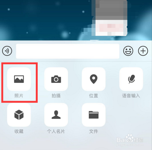 点击后,在屏幕下方弹出来的选项中选择【照片】,进入手机相册。