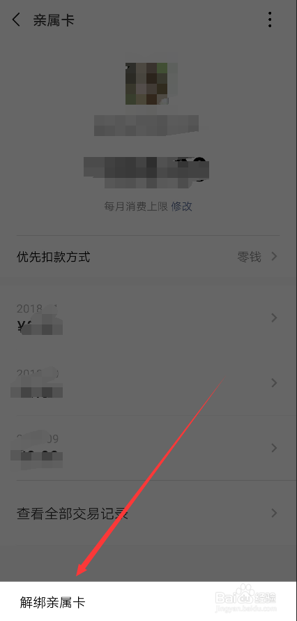 点击后在底部会弹出解绑亲属卡的按钮,直接点击解绑,如下图所示。