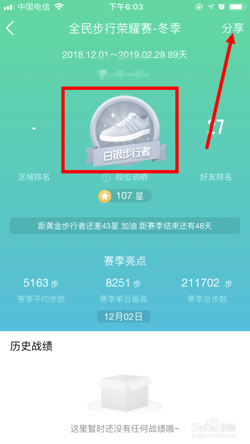 如许我们就可以看到本身的段位了。小编的当前段位为 白银步行者 ,而且当前拥有107颗星。点击下图红色箭头所指的位置,查看 积星详情 。