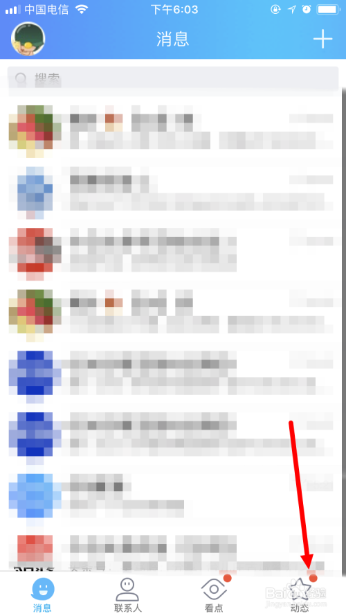 首先在手机上打开并登录QQ,并在首页面点击右下角的 动态 。