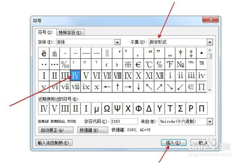 在“子集”中选择“数字形式”,并鄙人方选中年夜写罗马数字4(Ⅳ),点击“插入”。
