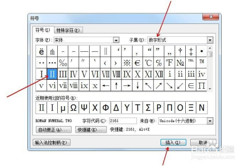 在“子集”中选择“数字形式”,并鄙人方选中年夜写罗马数字2(Ⅱ),点击“插入”。