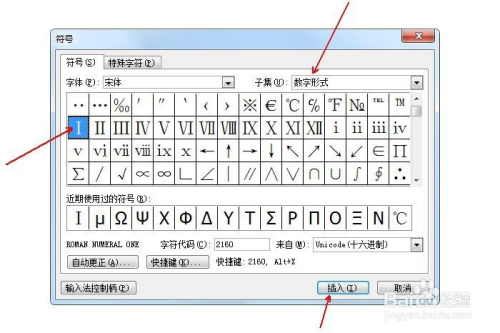 在“子集”中选择“数字形式”,并鄙人方选中年夜写罗马数字1(Ⅰ),点击“插入”。